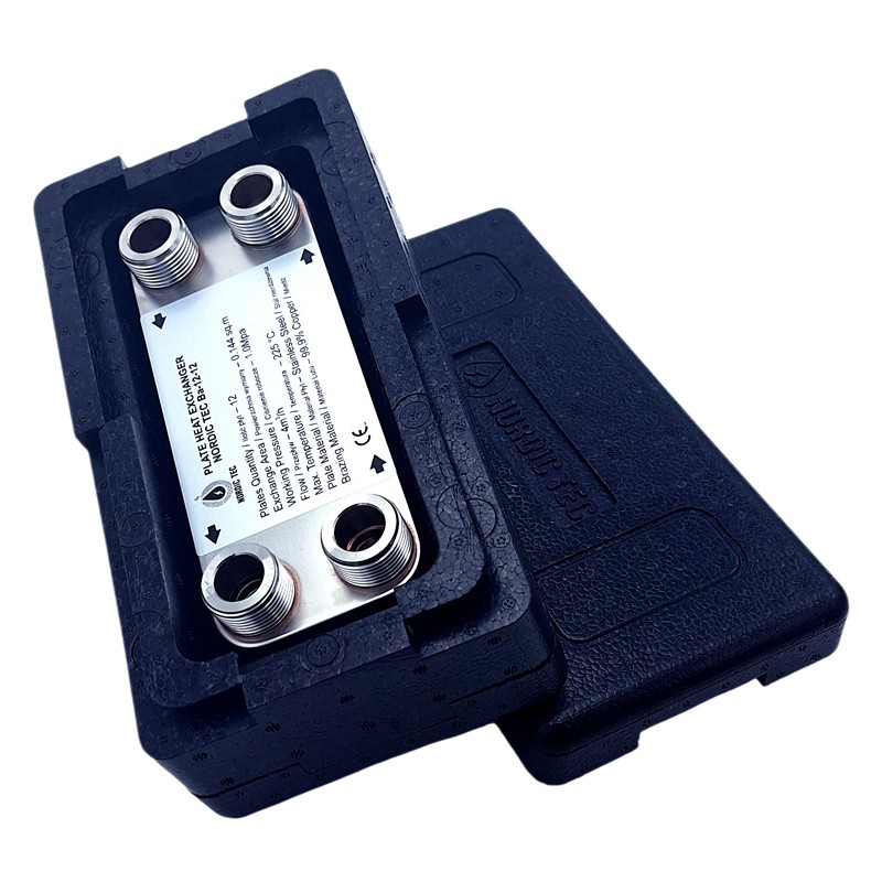 Cel mai mic schimbător de căldură cu plăci din catalogul producătorului Nordic Tec. Un schimbător de căldură cu 12 plăci utilizat pentru conectarea circuitelor suplimentare de încălzire sau răcire la sistemele de încălzire existente sau pentru sisteme mici de schimb termic. Dispozitivul are o suprafață de schimb termic de 0,14 m² și conexiuni de 3/4".
