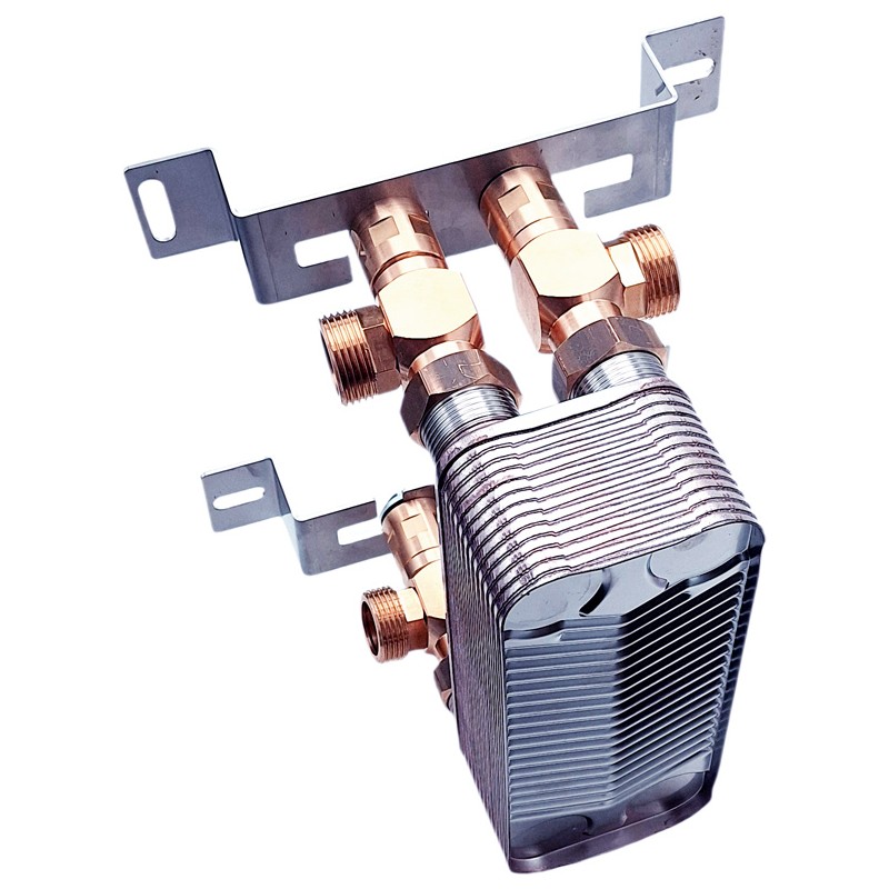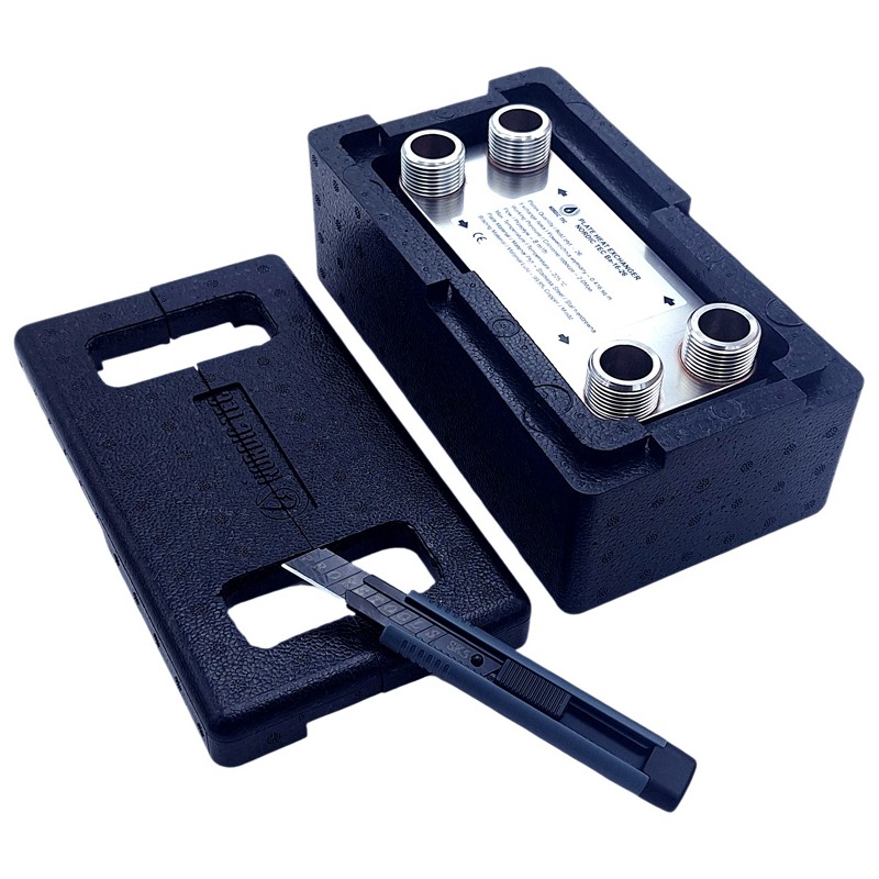 Schimbător de căldură de 105 kW - putere nominală (pentru parametri înalți, deci efectiv atinsă doar în condiții industriale). Schimbător cu 26 de plăci, cu posibilitatea opțională de achiziție cu izolație și suport de montaj (suport de montare pentru schimbătoare de căldură de 1 inch).