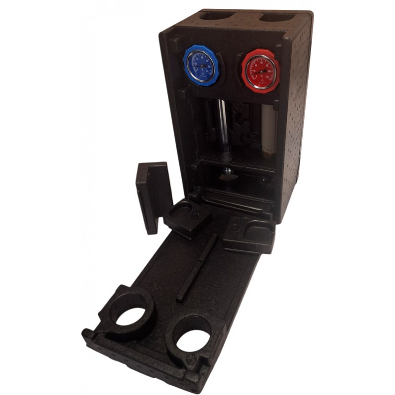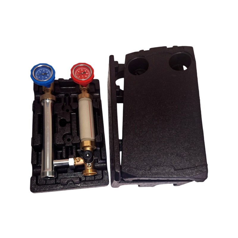 - Grupul include 2 supape cu bilă cu termometre în culorile tradiționale – albastru pe partea rece și roșu pe partea caldă