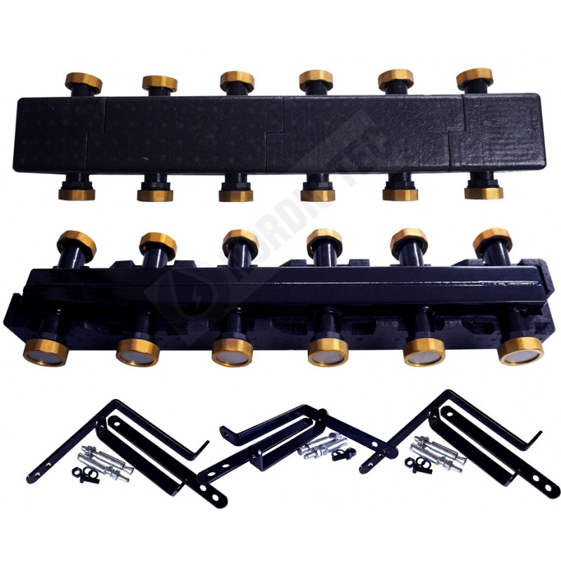 Colector - Distribuitor - colector pentru grupe de pompare care permite conectarea a 3 grupe de pompare pe o parte, cu un număr maxim de 5 grupe de pompare în total. În total are 6 circuite. Ideal pentru conectarea unui număr mare de grupe de pompare, precum și a mai multor surse de căldură, cum ar fi combinația dintre un cazan pe gaz și o pompă de căldură într-un singur sistem de încălzire.