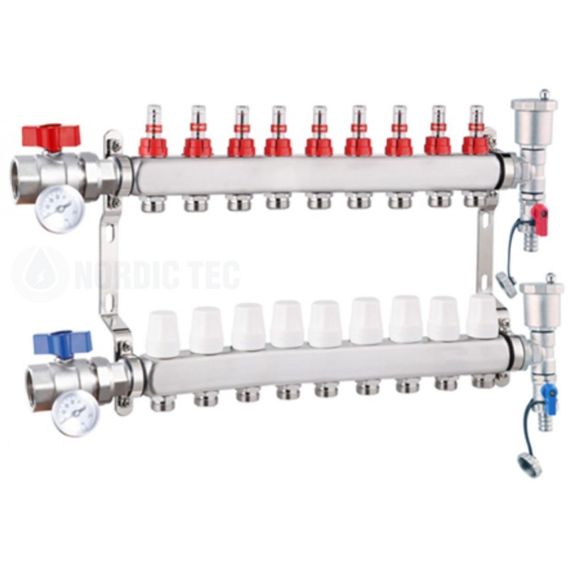 Distribuitor inoxidabil cu 9 circuite, din oțel inoxidabil. Set complet de distribuitor din oțel, echipat cu toate accesoriile vizibile în fotografii, pentru utilizare cu încălzire prin pardoseală sau radiatoare. Modelul cu 9 secțiuni din seria NORDIC TEC INOX, asamblat și gata de montaj.