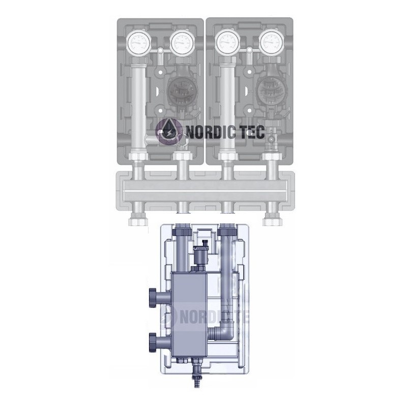 Separatorul hidraulic este destinat în principal distribuitoarelor și grupurilor de pompare Nordic Tec, însă datorită dimensiunilor clasice și distanțelor standard dintre racorduri, este foarte frecvent compatibil și cu distribuitoare de cazan ale altor producători.
