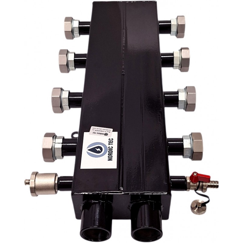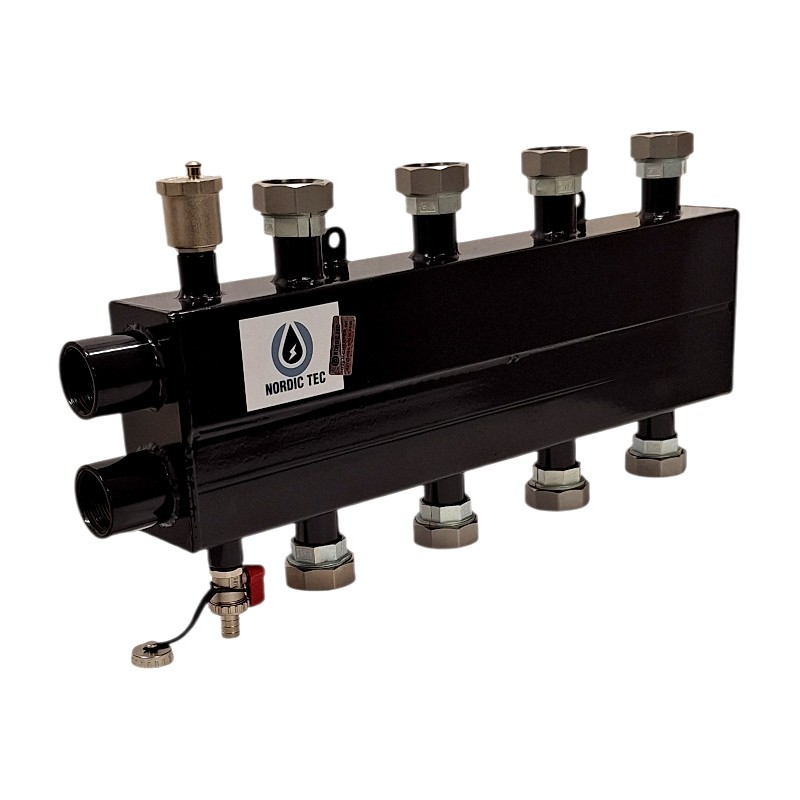 ✅ Distanța între racordurile separatorului-distribuitor este clasică, adică 125 mm. Este o distanță considerată standard, potrivită pentru majoritatea grupurilor de pompare, inclusiv pentru grupurile de pompare marca Nordic Tec. Este, de asemenea, identică cu alte distribuitoare tipice pentru grupuri.